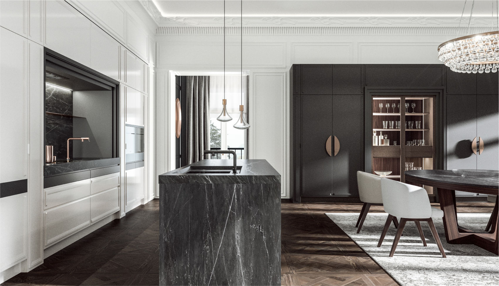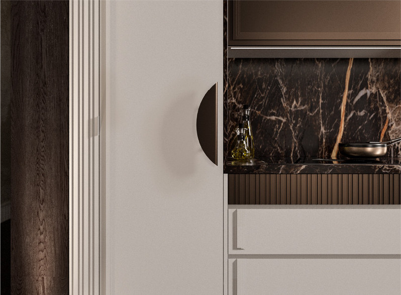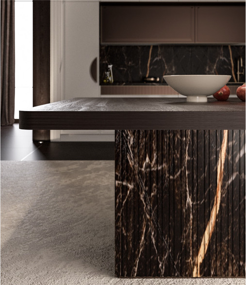 Si utilizzano varietà di forme, di materiali, di laccature: i tenui colori perlati si accordano con i colori metallizzati più decisi, mentre il Nichel Nero bene si accosta al metallizzato Bronzo2 Scuro delle maniglie e della capiente vetrina; la scelta del marmo Grafite, con le sue eleganti venature, è in coerenza con l’insieme. Gli importanti portali sono pensati per incorniciare la zona cottura e per valorizzare i mobili del soggiorno. Il tavolo Duse, con le sue linee contemporanee e il legno di noce con cui è realizzato, contribuisce a questo affascinante mix di tendenze.